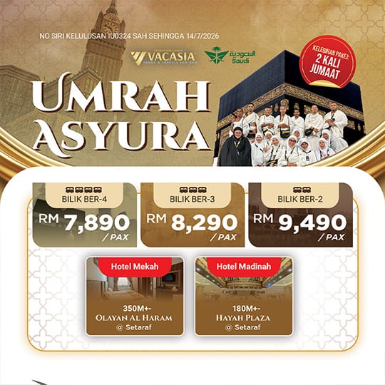 Tarih Berlepas 02 July 2025 Tarih Pulang 13 July 2025 Bilangan Hari 12 HARI 10 MALAM Penerbangan Saudia Airlines Hotel Mekah OLAYAN AL HARAM @ SETARAF +- 350M Hotel Madinah HAYAH PLAZA @ SETARAF +- 180M Harga Dari Rm 7890 Berminat