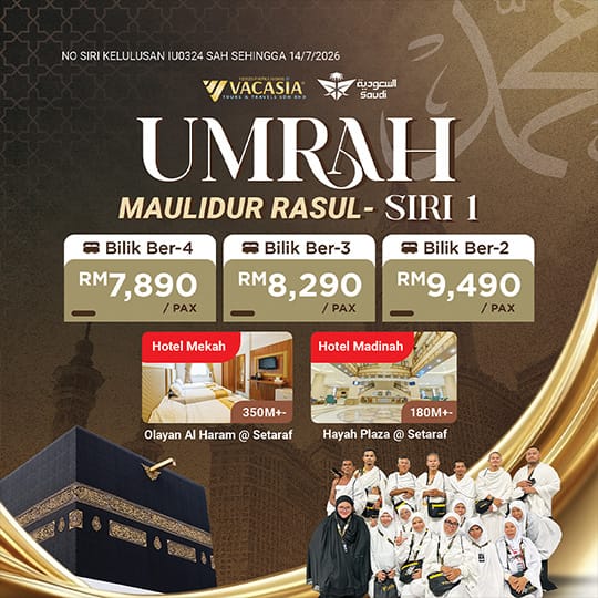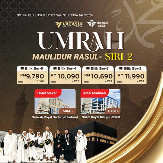 Tarih Berlepas 03 September 2025 Tarih Pulang 14 September 2025 Bilangan Hari 12 HARI 10 MALAM Penerbangan Saudia Airlines Hotel Mekah SAFWAH ROYAL ORCHID @ SETARAF +- 50M Hotel Madinah NOZOL ROYAL INN @ SETARAF +- 150M Harga Dari Rm 9790 Berminat